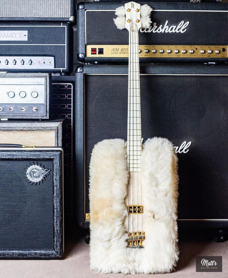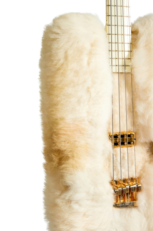 Este bajo de piel forma parte de esa leyenda visual. Procede directamente de la colección personal de Dusty Hill. Fabricado por el luthier de confianza del grupo, John Bolin, sigue el estilo rectangular de la Gretsch Bo Diddley, recubierto con piel de oveja blanca e incorporando pastillas Gretsch TV Jones. Solo existen dos ejemplares de este modelo. Muy utilizado en giras por todo el mundo, muestra un evidente desgaste tanto en el mástil como en la piel.