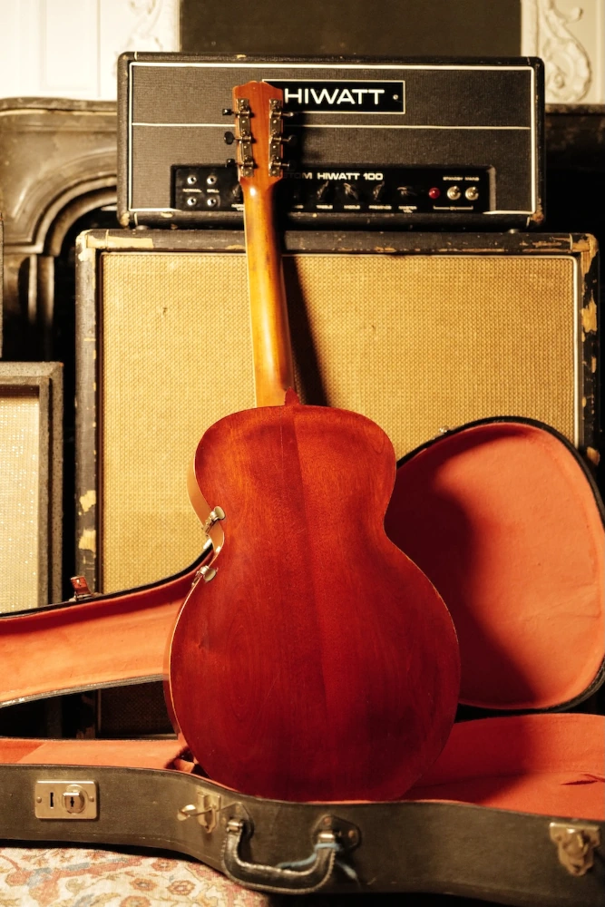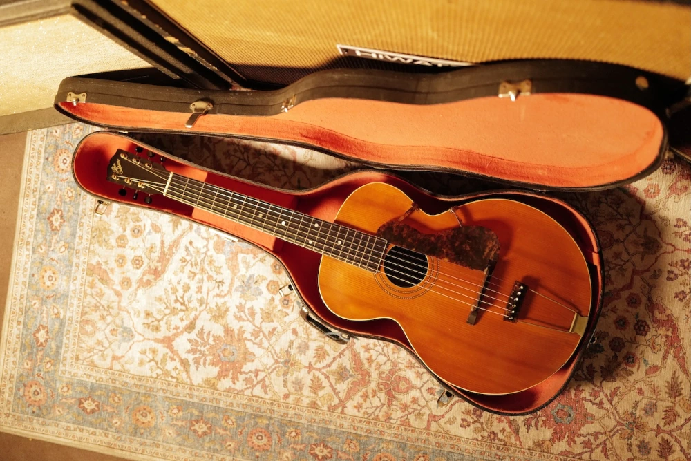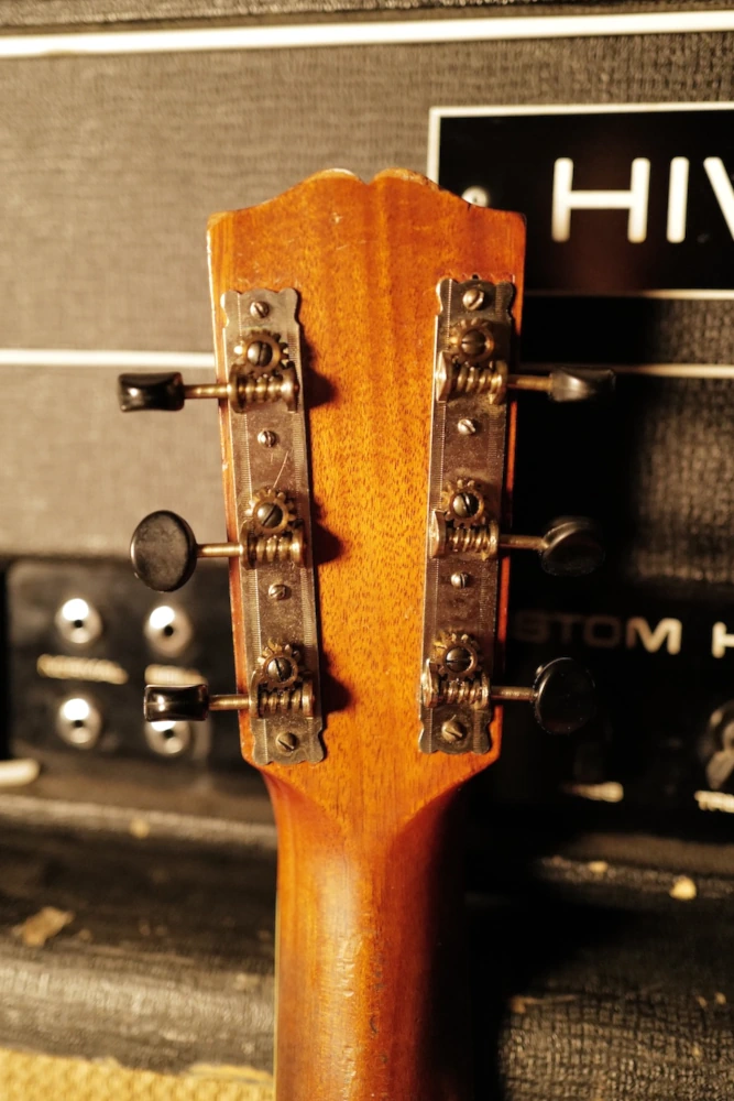 Cette Gibson L-1 de 1917 témoigne de l’ingéniosité technique de l’époque, combinant une structure d’archtop avec une table d’harmonie percée d’une rosace ronde, une configuration rare emblématique des débuts de la marque. Sa table en épicéa sculpté et sa caisse aux courbes prononcées produisent une signature sonore unique : une attaque franche, un timbre boisé et une compression naturelle qui rappellent les premiers enregistrements de blues et de ragtime. L’instrument conserve ses attributs d’époque, notamment le logo « The Gibson » incliné sur la tête, son cordier et son chevalet d’origine, affichant une authenticité rare après plus d’un siècle.